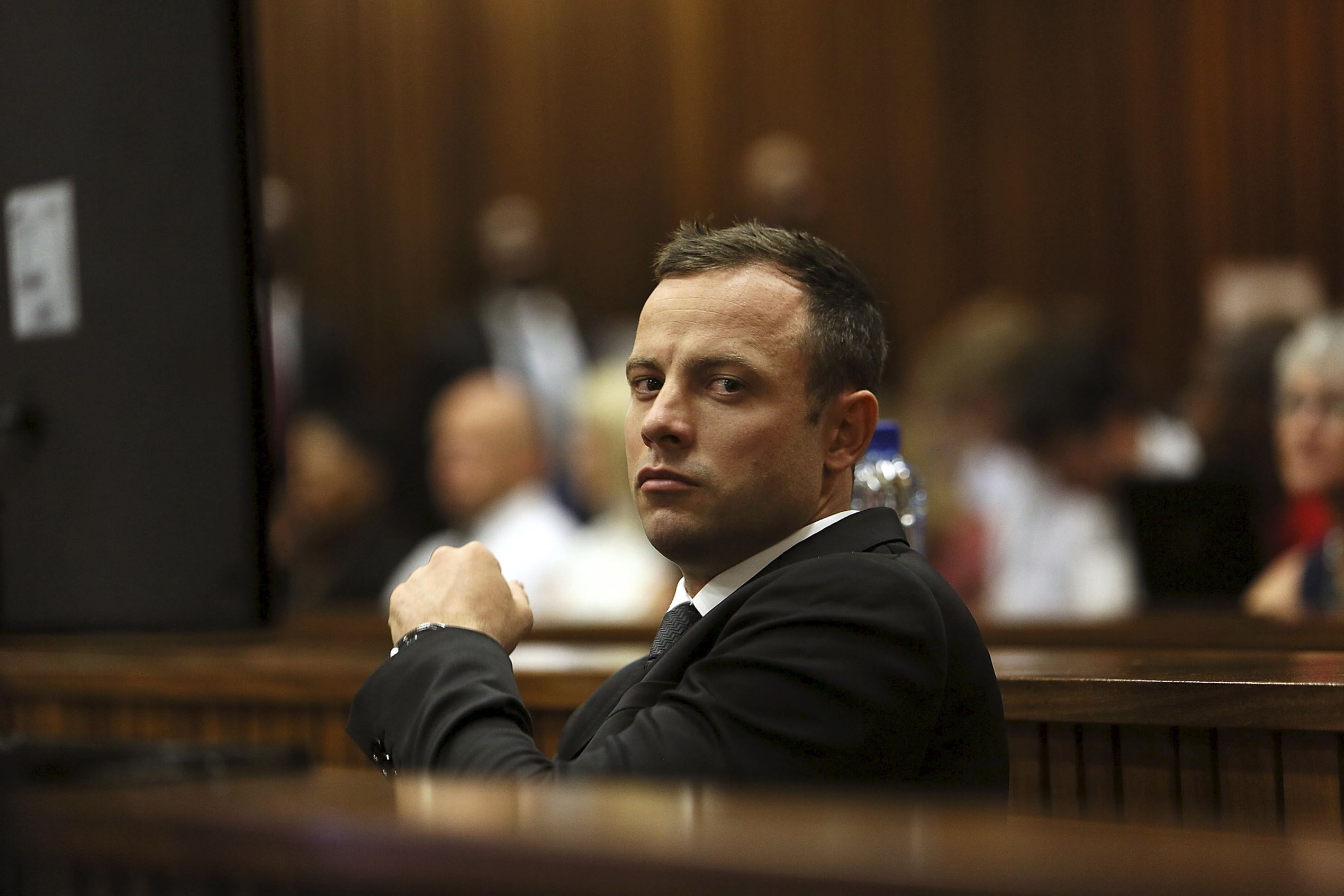 Olympic and Paralympic track star Oscar Pistorius sits in the dock on the third day of his trial for the murder of his girlfriend Reeva Steenkamp on March 5, 2014, at the North Gauteng High Court in Pretoria, South Africa. A court found last year that Pistorius didn't intend to murder Steenkamp, but that he acted with gross negligence, firing four times through the toilet door in his bathroom. He maintained that he believed an intruder, not Steenkamp, was behind the door.
